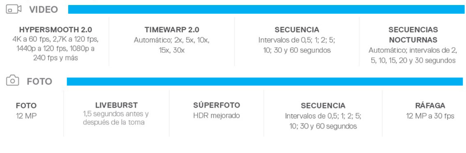 - Estabilización mejorada de HyperSmooth 2.0 y time-lapse de TimeWarp 2.0